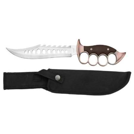 This knife with simulated wood grain handle and finger holes measures 13-1/2 overal