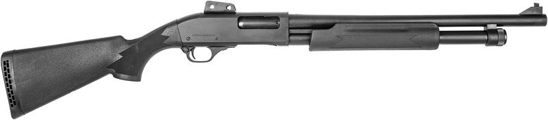 982 Hawk Pump Action 12 GA Shotgun Patterned after America's favorite 12 ga. pump, the Remington 870. Specifications 12 gauge 3" chamber 18.5" barrel 7 lbs. Pump action Dual action bars 5 round capacity Tube fed Fixed improved cylinder choke Black polymer stock Machined solid steel receiver Front bead sight Adjustable ghost ring sights 38.5" overall length Matte black