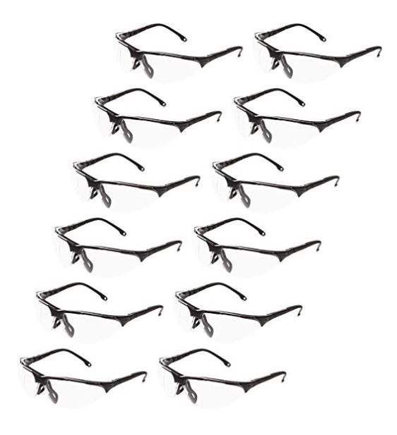 12-pack of shooting safety glasses provides important eye protection; designed for both women and men Clear lens made of strong polycarbonate; ideal for use at an indoor shooting range or when hunting outdoors Anti-fog coating helps prevent lens from fogging up—especially useful in humid conditions Durable, yet lightweight black frame provides a comfortable fit; sleek, sporty appearance Measures 6.1 by 5.8 by 1.9 inches (LxWxH); backed by an AmazonBasics 1-year limited warranty