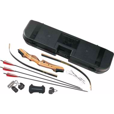 Cabela's Ranger 62" Recurve Bow is built with traditional style and is designed for beginners. Beautiful hardwood riser features a comfort grip that is warm in the hand. Wood core and black fiberglass limbs power arrows with amazing authority. Equipped with sight and stabilizer bushings, arrow rest, string and nock set. Package includes: bow, three carbon arrows, leather armguard, full-finger glove, bow stringer and hard case.