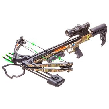Package includes: 4x32 scope, quick detach three-arrow quiver, three 20" Piledriver arrows, three 100-grain field points, rope cocker and rail lubricant.