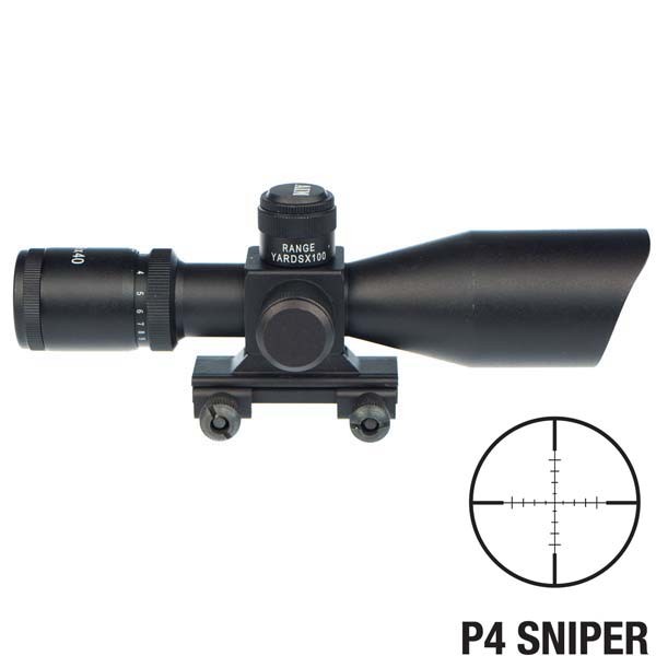 AIM SPORTS 3-9X40 TITAN DUAL ILLUMINATED SCOPE Picatinny Mount P4 Sniper Reticle MOA 1/4 With BDC for .223 1 Inch Tube Diameter * One piece aircraft grade aluminum body built to withstand constant heavy recoil * Nitrogen charged with water resis