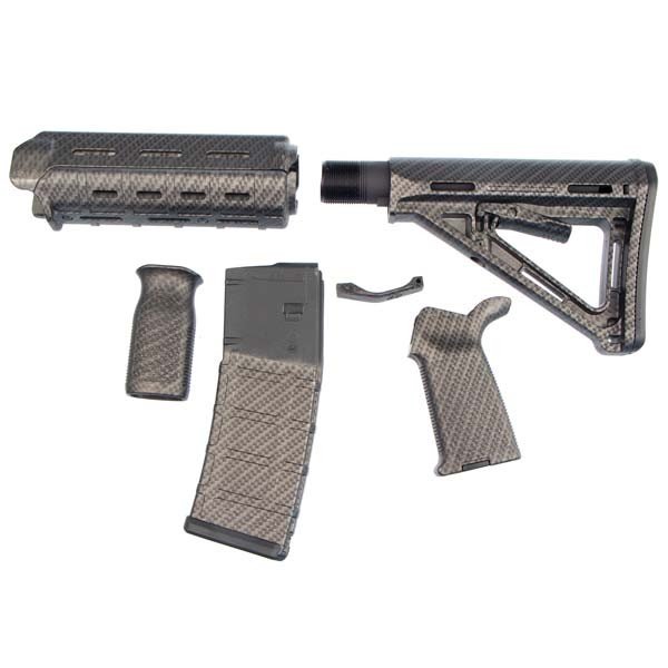 AR15 MAGPUL MOE FURNITURE KIT CARBON FIBER (7 Piece-Mil Spec) Includes: Magpul MOE Carbine Mil-Spec Buttstock and Buffer Tube, MOE Carbine Hand Guard, MOE Pistl Grip, MOE Vertical Grip, MOE Trigger Guard, One 30-Round PMAG magazine Turn your AR-15