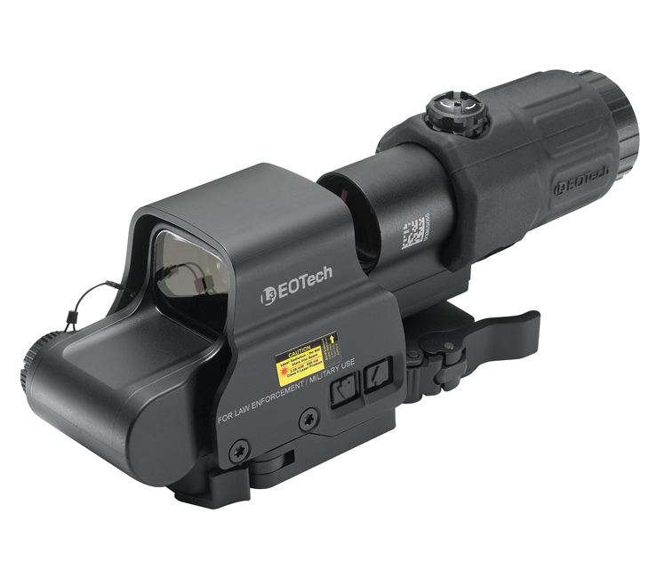 EOTech Hybrid II Holographic Sight - This combo weapons site features the EXPS2-2 Holographic site with a switch-to-side mounted G33 3x magnifier. Either use the Holographic site alone, or flip up the magnifier for a close up view. The reticle is a 65MOA circle with two 1MOA aiming dots.