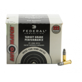 Federal Auto Match .22LR 40gr Lead Round Nose 325rd AM22 MFR# AM22UPC: 029465057350Rounds Per Box: 325Muzzle Energy: 128 ft-lbsMuzzle Velocity: 1200 fpsDescription:Find a nice range of capable target shooting options for your rimfire guns. If you're looking for the most performance for your dollar, look to the 40-grain solid AutoMatch 22LR—its sweet-spot velocity make it perfect for 10/22 actions and other autoloading firearms.