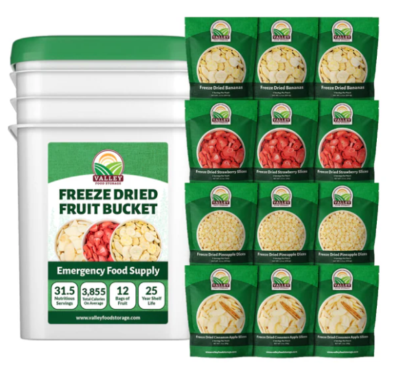 The Valley Food Storage Freeze Dried Fruit Bucket features a 12 pouch variety of our most popular freeze-dried fruit options. These fruits were picked at peak freshness and freeze-dried to preserve the integrity of the produce and the nutrients found within it.