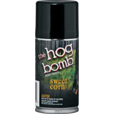 The Hog Bomb: Sweet Corn scent is a food-grade attractant used as flavoring for cattle, equine and hog feed to stimulate the appetite. When dispersed, it forms a gas cloud for unparalleled downwind range. Disperse it in short bursts from your treestand or ground blind or lock it down to fog out the entire contents. It can travel downwind in excess of 1/4 mile in a 3-mph breeze, leaving a natural scent trail back to the can. The sweet corn scent creates a barrier between you and animals approaching from downwind. The Hog Bomb: Sweet Corn no-hassle can eliminates fumbling for scent wicks, cotton balls, drag lines or bottles of scent. It can be carried in your pocket and has a 180-degree valve that can be sprayed upside down. 5-oz. aerosol can.