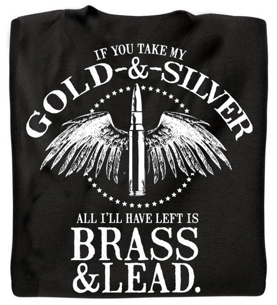 Only $17.95! (You save $9.00) Description Reviews Related Products Product Videos Warranty Also Viewed By Category Other Details If you take my Gold & Silver... All I'll have left is Brass & Lead. Printed on the back of a black t-shirt. Because our shirts are custom-printed right here in Powder Springs, GA, please allow 9-14 days for processing.