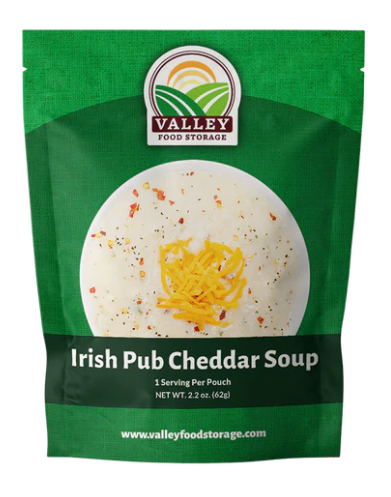 Valley Food Storage Cheddar Potato Souphas been the favorite of our customers since day one. Delicious and hearty soup that the whole family can enjoy. Each pouch of Irish pub cheddar potato soup contains 5 servings.