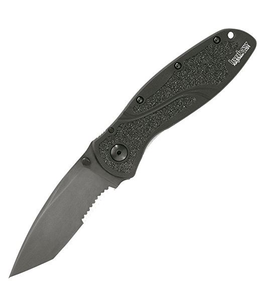 Kershaw Blur Tanto Black Serrated (1670TBLKST); 3.4” DLC-Coated, 14C28N Steel, Partially Serrated Blade; Anodized Aluminum Handle with SpeedSafe Opening, Lanyard Hole, Reversible Pocketclip; 3.9 OZ