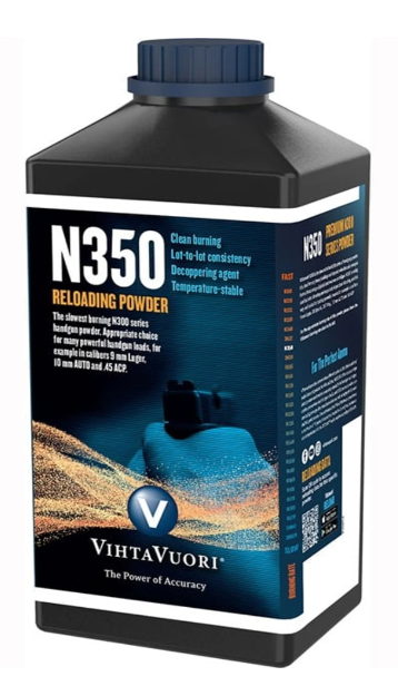 VihtaVuori N350 is the slowest in the N300 series of handgun powders, and is ideal for very heavy loadings, and top end velocities and energies from a broad range of pistol and revolver cartridges. It is very well suited to loading powerful rounds for example in calibers 9mm Luger, 10mm AUTO and 45 ACP.