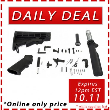 Includes PSA M4 Stock, A2 Pistol grip, Palmetto State Armory Classic Lower Parts Kit and Mil-Spec diameter 6-position 7075 aluminum buffer tube assembly. Everything you need to finish your stripped lower.**Buffers may not have a logo and may also be charcoal in color.