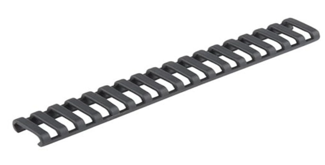 Flexible ladder-style panel snaps securely into unused cross slots on Picatinny rails, protecting against dirt and dings and improving grip and weapon control. Prevents sharp rail edges from digging into your hand, snagging on clothing, and causing damage to gear, like cut and frayed slings or repelling ropes. Made of rubbery, slip-resistant Santoprene™ thermoplastic elastomer, the ultra-low-profile design keeps your handguard diameter slim. Covers 18 slots or can easily be trimmed to custom lengths and fitted between mounted accessories. To remove, simply pry up a corner and peel off. SPECS Santoprene rubber. 6-15/16" (17.6cm) long. Fits one side of standard carbine-length 1913 Picatinny rail. Manufactured by Falcon Industries.
