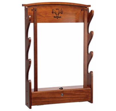 The Redhead 1856 4-Gun Rack keeps firearms high and dry where they're easily accessible. Solidly constructed of pine and finished with a warm Brown Cherry stain, the 1856 4-Gun Rack handsomely displays 4 long guns of virtually any size or shape. A lockable bottom drawer provides a safe place for ammunition storage, or gun cleaning supplies. The Redhead 1856 4-Gun Rack measures 25.5"W x 37"H x 6"D, and weighs 13 lbs. Imported.
