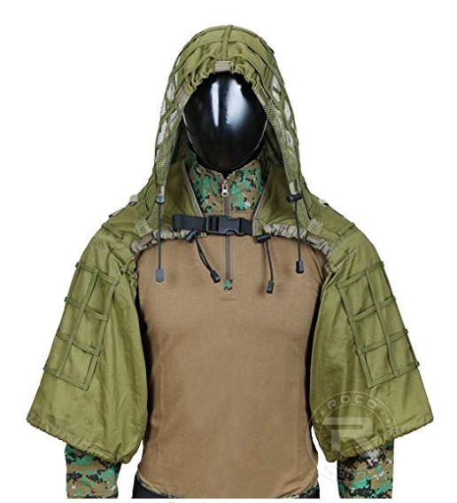 The Sniper Viper Hood: Made of washable cotton + heavy duty buckle, nylon drawstring. It is lighter and cooler than a BDU jacket.