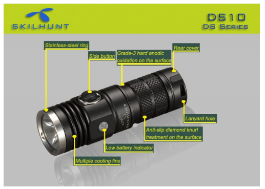 Drive all darkness away with our Skilhunt(DS10) XM-L2 800LM 10W Strong White Light Flashlight highly introduced here! Highlighted by super bright XM-L2 LEDs with high performance and efficiency, scratch-resistant aluminum body for long-term use and reasonable thermal design for heat dissipation, our flashlight proves to be the most suitable solution for daily use and outdoor exploration. It also provides user-friendly interface with a side switching button and different lighting modes for various environment. Moreover, automatic memory function, reverse power protection and low voltage indication are all supported. A bargain for you!