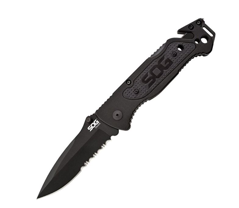 SOG Escape Folding Knife FF25-CP - Built-in Strap Cutter & Glass Breaker, Hardcased Black 3.4" Blade, Aluminum Handle