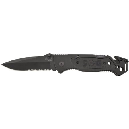 SOG Specialty Knives & Tools FF25-CP Escape Knife with Part-Serrated Folding 3.4-Inch Steel Blade and Aluminum Black Handle, Hardcase Black Finish