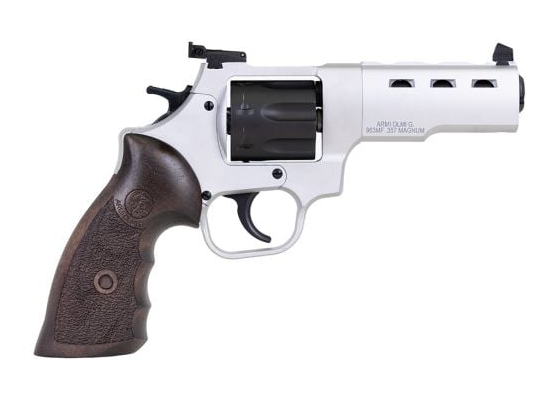 This revolver features the classic double action functions that we all know, but with some added upgrades for today's shooter. This model has a unique cylinder that has a capacity for seven rounds of .357Mag/.38Sp ammo. The frame is made from an alloy steel, allowing the revolver to be lighter weight. Each revolver is fit with shaped wood grips that are comfortable for all hand sizes. The hammer has an exposed spur so you can shoot this model as a double action or single action. The front and rear sights are dovetailed, allowing for easy removal for aftermarket sight options. The external barrel cover is vented and tapped to allow for a bottom rail to be mounted.