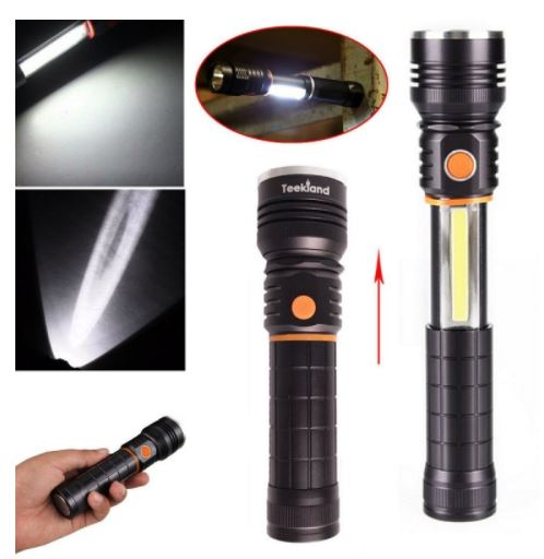 Featuring high brightness and low power consumption, this TEEKLAND 5W T6 + COB 850lumens 4 Modes Focusing Rotary Flashlight is worth having! It is made of solid aluminum and plastic materials, strong and durable in use. With 4 working modes, it allows you to select the most suitable mode for actual use. Also, stretchable design makes the flashlight room-saving for easy storage.