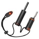 Compact fire starter with ferrocerium rod and metal striker Lanyard to keep product secure and together Emergency whistle, integrated into lanyard cord...