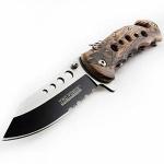 SPRING ASSISTED 3" 3MM THICK BLADE, STAINLESS STEEL TWO TONE HALF SERRATED BLADE 4.75" CLOSED FALL CAMO ALUMINUM HANDLE